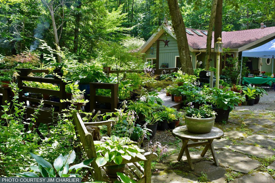 Smug Creek Gardens reside on rather a unique wooded property. A shallow slate creek, after which the gardens are named, flows in a wide gentle curve through the gardens and then directly under the house. It emerges from the front of the house and falls into a deep ravine. In all there are thirteen wooded acres upon which the Shadracks have created four different gardens surrounding the house.